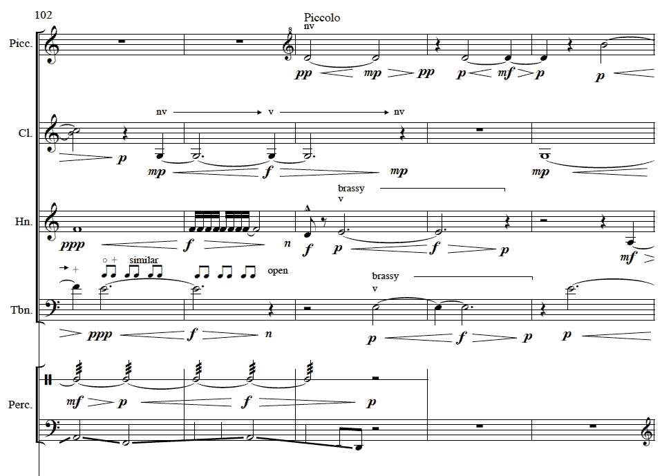 The score calls for flute/piccolo, clarinet in B-flat, horn in F, trombone, percussion, violin, viola, cello, and double bass.