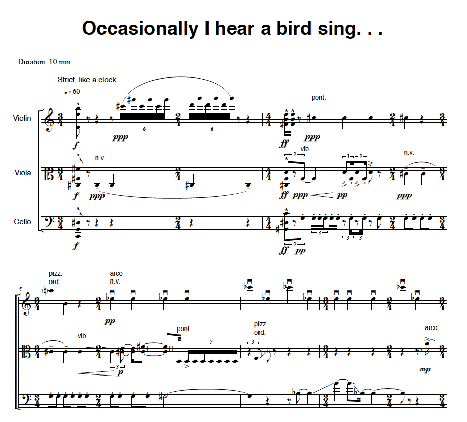 The composition features bird songs and calls recorded summer 2009 from BREC City Park in Baton Rouge, Louisiana. A selection of the recorded bird songs were transcribed, transposed, fragmented, or modified to fit specific musical situations, which in-turn controlled the structure of the piece.