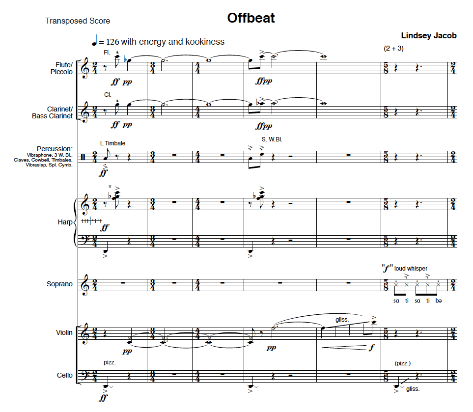 The score calls for flute/piccolo, clarinet in B-flat/bass clarinet, percussion, harp, soprano, violin, and cello.
