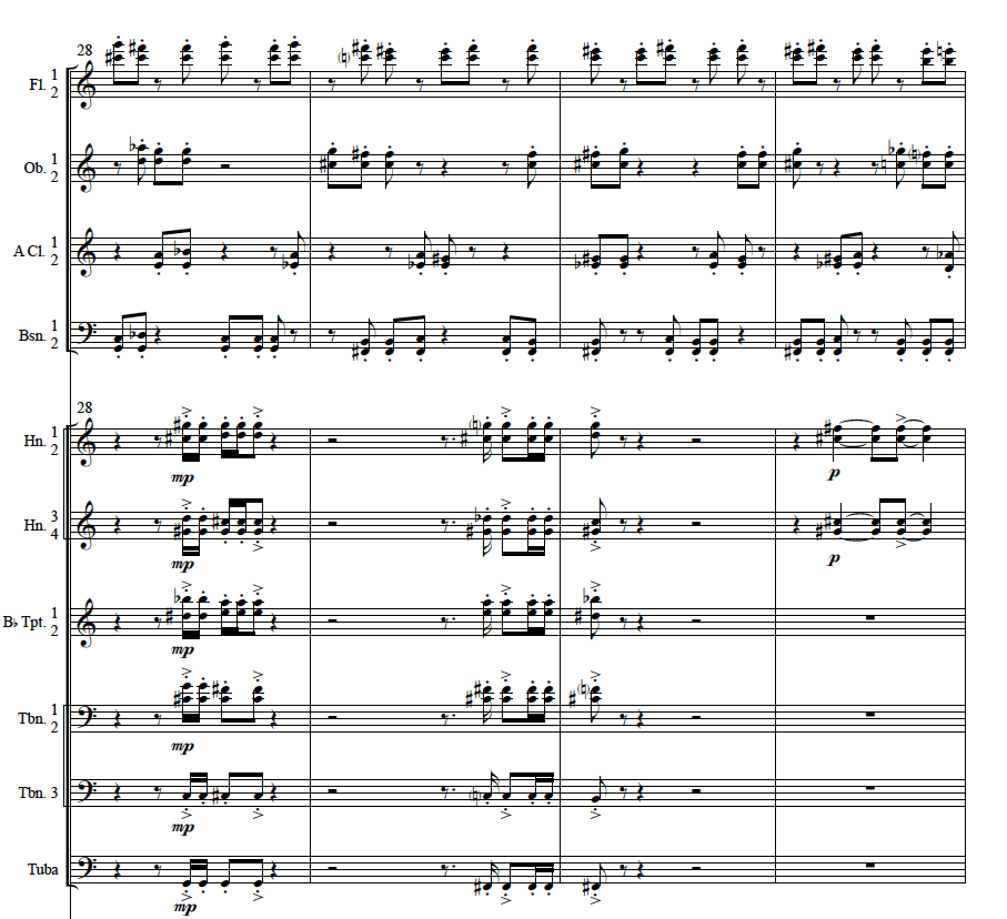 An important structural moment occurs during a brass feature, before the first statement of “love.” This passage of text details the power of love and how even unspoken love can increase the worldʼs light. Wilcoxʼs text is reminiscent of a Biblical passage in John 1: “Lux lucet in tenebris” [Light shines in the darkness]. While these texts hail from differing spiritual points of view, they share philosophical and symbolic associations concerning the essence of thoughts, words, life, love, and light. This literary connection is represented musically through the use of quotation; the chords stated in the horn soli are quoted from a childrenʼs chorus statement of “Lux lucet in tenebris!” in George Crumbʼs Star Child. The placement of these chords parallels the literary association in that Crumbʼs music often addresses themes of light and dark.